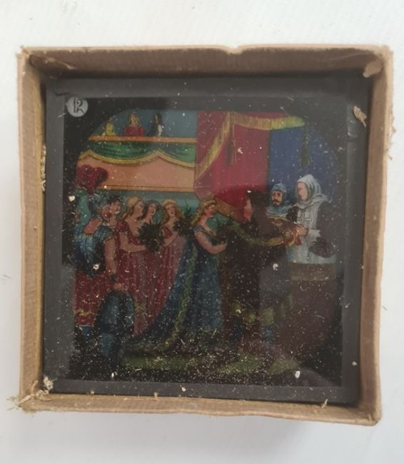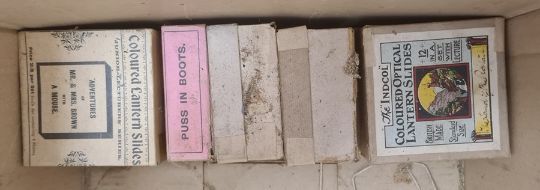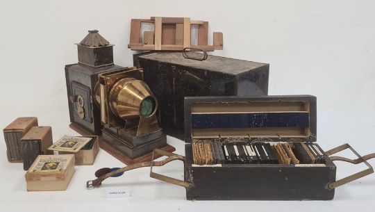 Antique brass black japanned metal magic lantern in metal carrying case and large quantity of boxed magic lantern slides