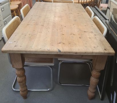20th century pine-topped rectangular table on turned supports, peg feet, the top 90 x 164cm