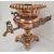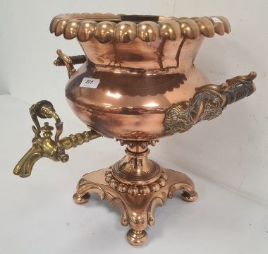 Large Victorian copper and brass two-handled hot water urn with gadrooned border, scroll handles, brass tap and on square base raised on four bun feet (lacking cover), 35cm high