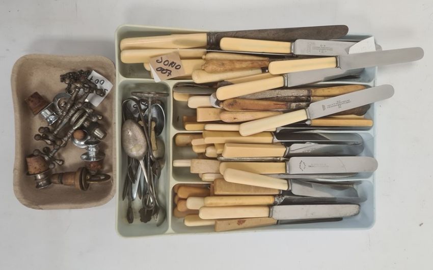 Quantity of flatware including ivory-type handled knives, spoons, bottle stopper and a quantity of costume jewellery