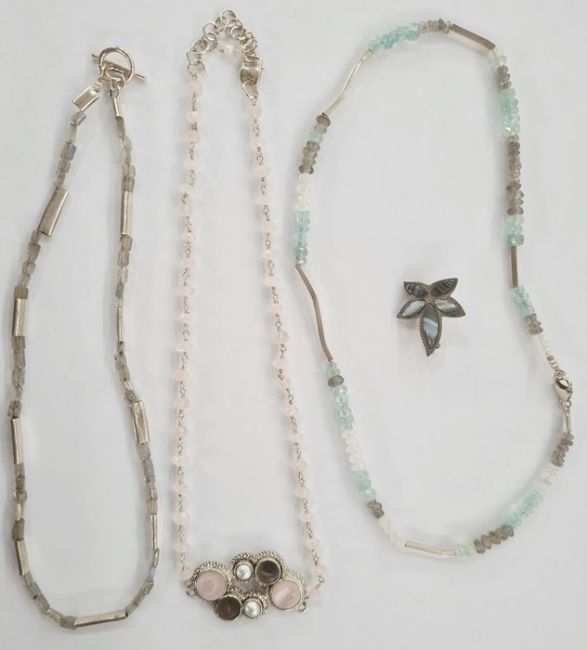 Silver leaf brooch, silver and semi-precious stone necklaces, rose quartz, etc (1 box)