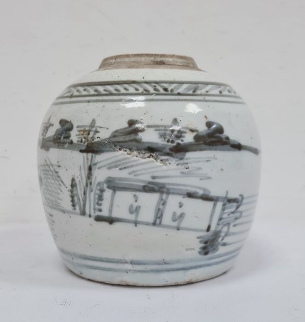 Old Chinese ginger jar of typical form with underglaze blue painted decoration, lake scene with boat and figures, 15cm high