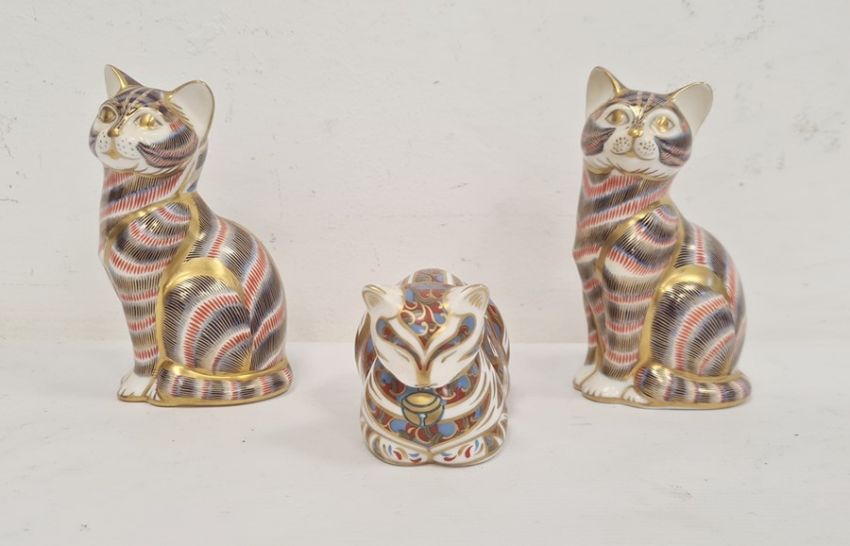 Two Royal Crown Derby seated cat paperweights and another cat lying down (3)