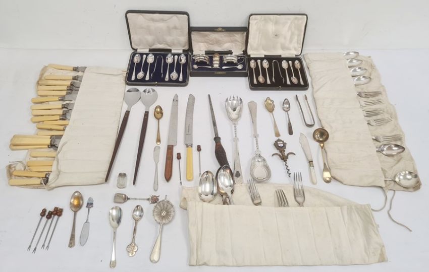 Silver-plated cased cruet set, cased teaspoons and sugar tongs, other cased silver-plated items, quantity of flatware, etc (1 box)
