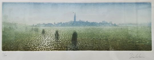 Twentieth century continental schoolAquatintView of Venice from the lagoon, indistinctly signed in pencil and numbered 2/30, with blindstamp, 7.5cm x 23cm