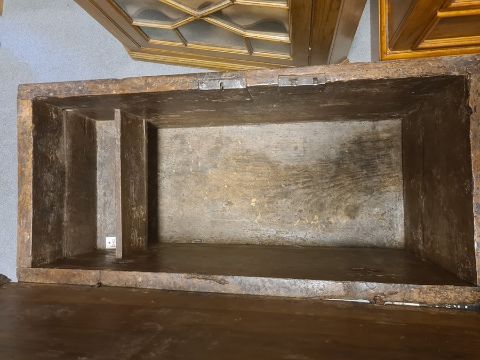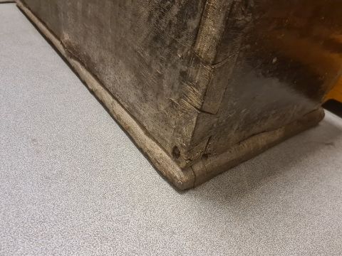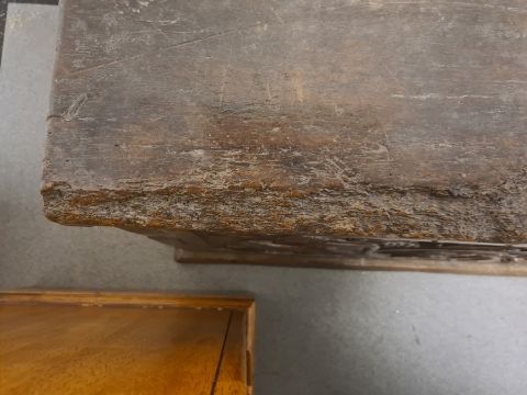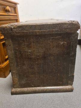 Antique carved oak coffer, the front panel with foliate scroll and all on plinth base, 91cm wide (probably part 16th century) Condition ReportIt is very damaged to the top, with large worn areas as well as some wood worm holes. There is also some damage to the front and sides.. The width is 91cm X the depth is 41cm X the height is 47cm. See attached images.