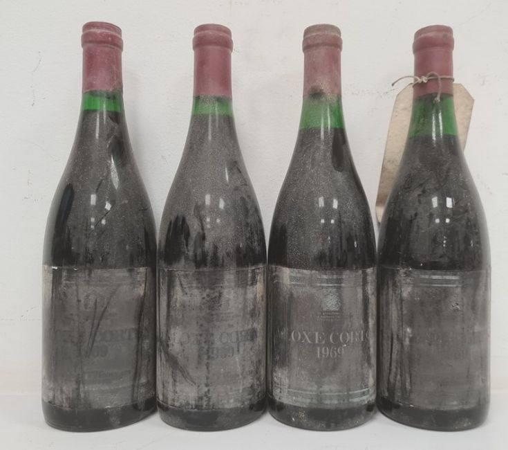 Four bottles of 1969 Aloxe-Corton (labels damaged) (4) (Provenance - this lot has been stored in a manor house cellar with a natural spring and high damp levels. All bottles sold as found.)