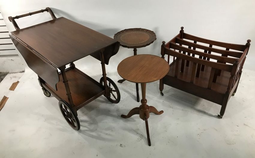 Tea trolley, a modern Canterbury and two wine tables (4)