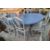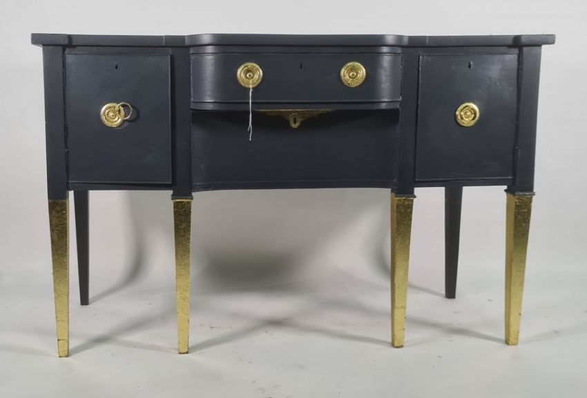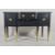 Painted reproduction Regency dining table, six chairs and sideboard painted in blues and grey