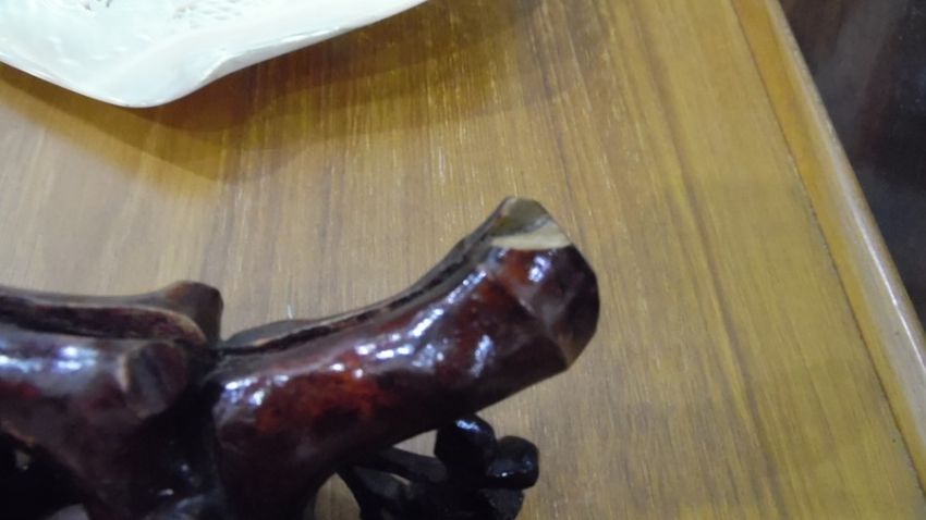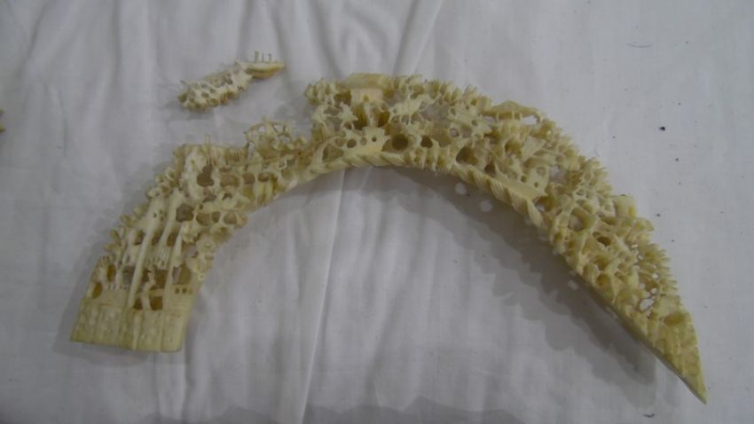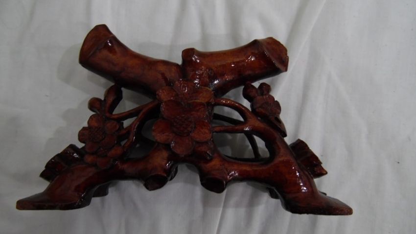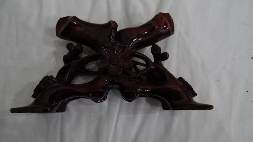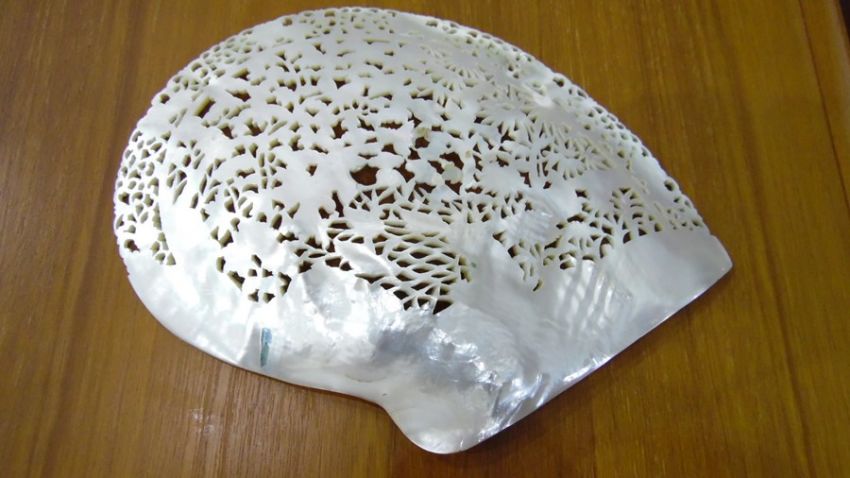 Chinese carved shell, intricately pierced and carved with ducks on a pond surrounded by flowers and birds, 23cm long, on hardwood stand, an early 20th century carved tusk with houses and trees (damaged) and one other item (3) Condition ReportThe shell appears good with no obvious visible damage. There is one chip on the hardwood stand. See added photos