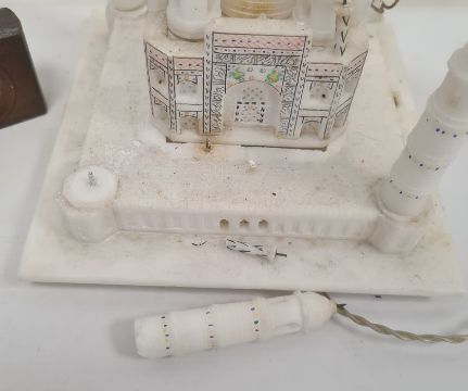 Alabaster model of the Taj Mahal (with damage), a pair of racing glasses and a wooden and brass and hardwood spirit level