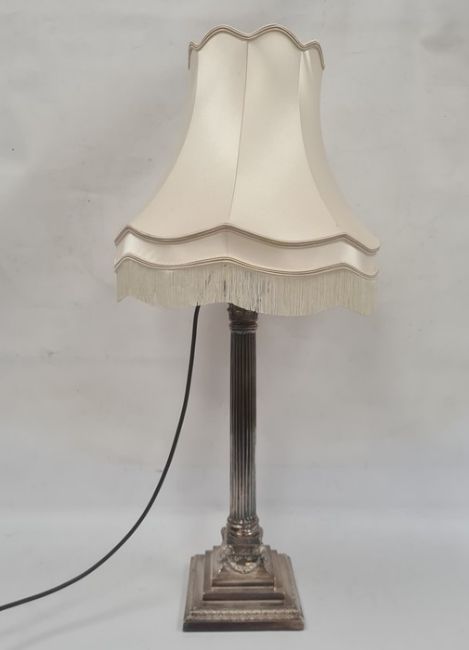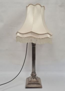 Large silver-plated corinthian column table lamp with ram's head detail, on square stepped base, 47cm high