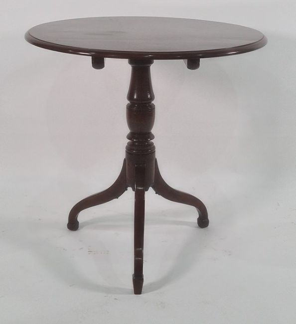 Georgian mahogany snap-top circular centre table with moulded edge, turned pedestal to three cabriole legs