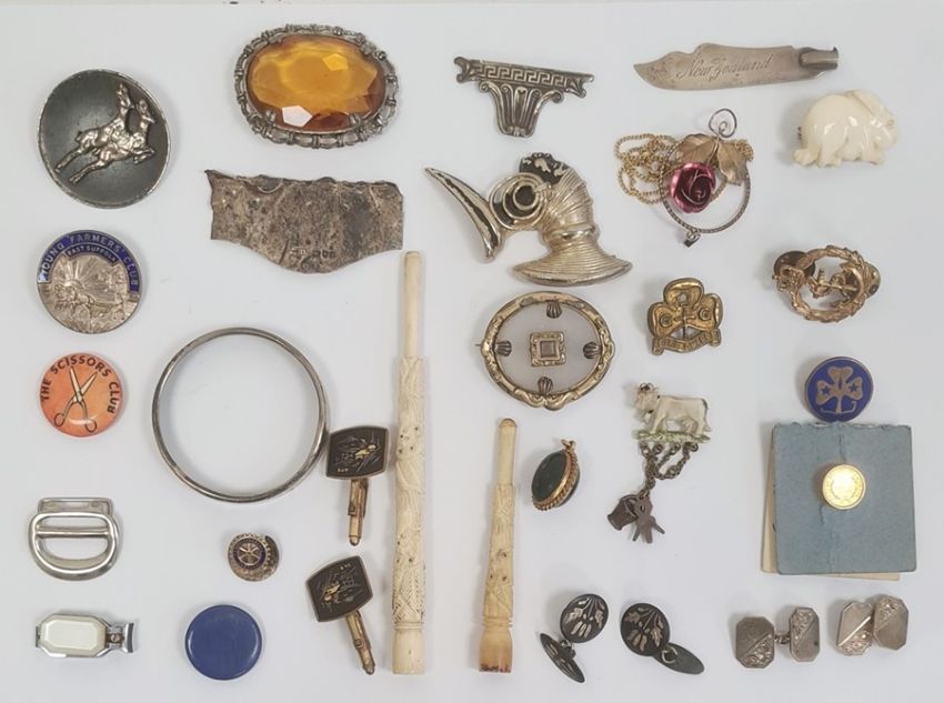 Silver cufflinks, other assorted cufflinks, badges, costume jewellery, pendants, silver mount, etc (1 box)