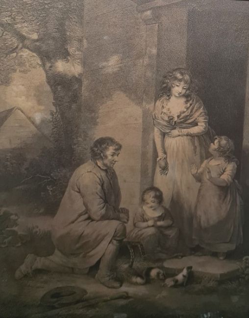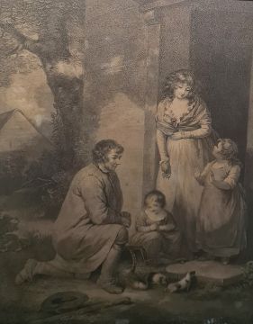 After George Morland, Etching, 'Guinea Pigs' in verre eglomise frames
