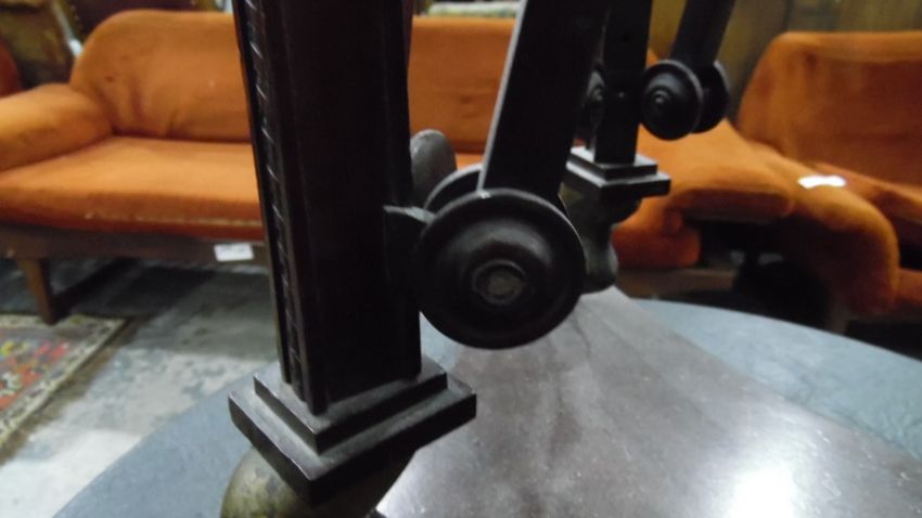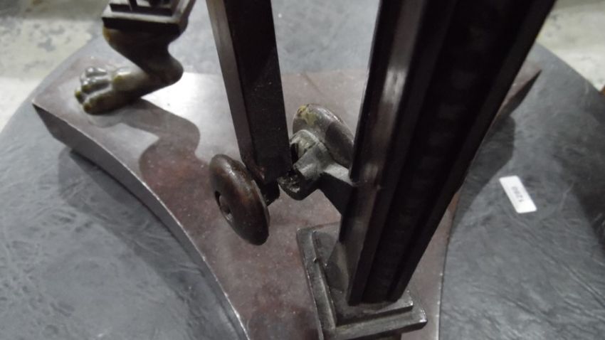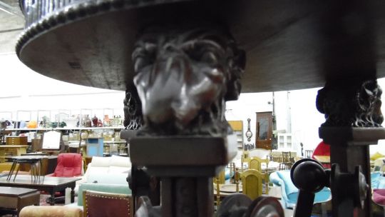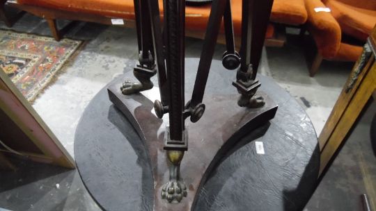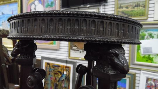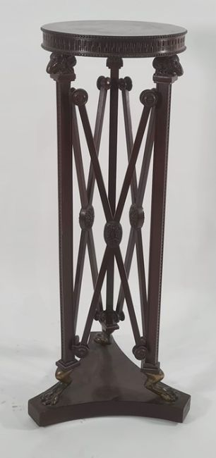 19th century mahogany aspidistra stand, the circular top above a base of Egyptian taste, to triform plinth, 32.5cm x 99cm Condition ReportOne pair of roundels at the base have been replaced and others are slightly damaged. One diagonal strut is split at the joint. See added photos.