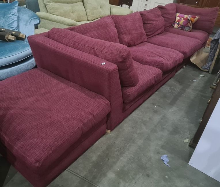 MultiYork corner sofa and pouffe in plum upholstery, with two scatter cushions