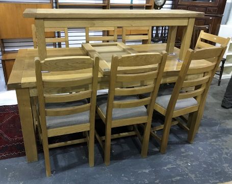 Modern oak dining table, 6 matching chairs and bench, and one further chair