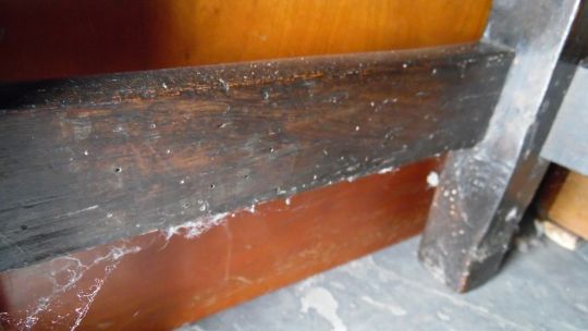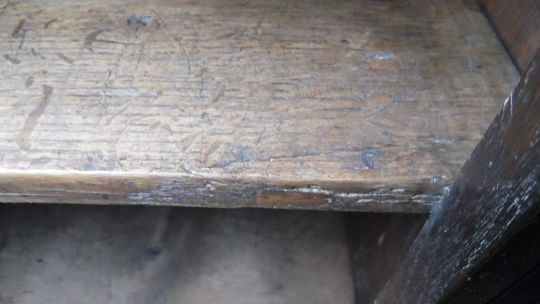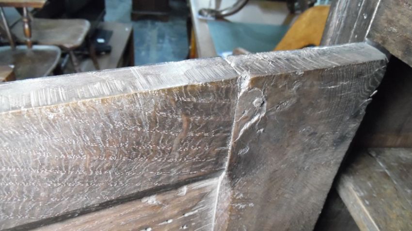 18th century oak livery cupboard, the rectangular top above cupboard door with pierced flowerhead decoration, on base with single drawer, square section supports and stretchered, 68.5cm x 123cmCondition ReportThere is evidence of old damage and repairs and some woodworm damage. See photos
