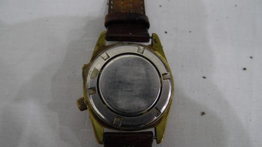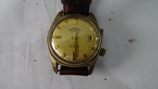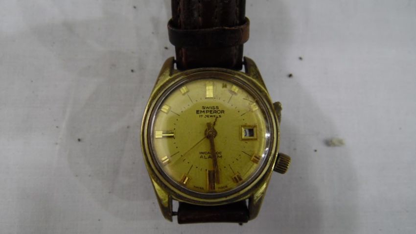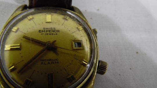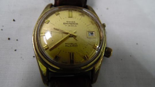 With regards to the Incabloc Emperor. The movement appears to be working. The minute hand catches the hour hand and the date and aperture are misaligned. One button is missing. See added photos