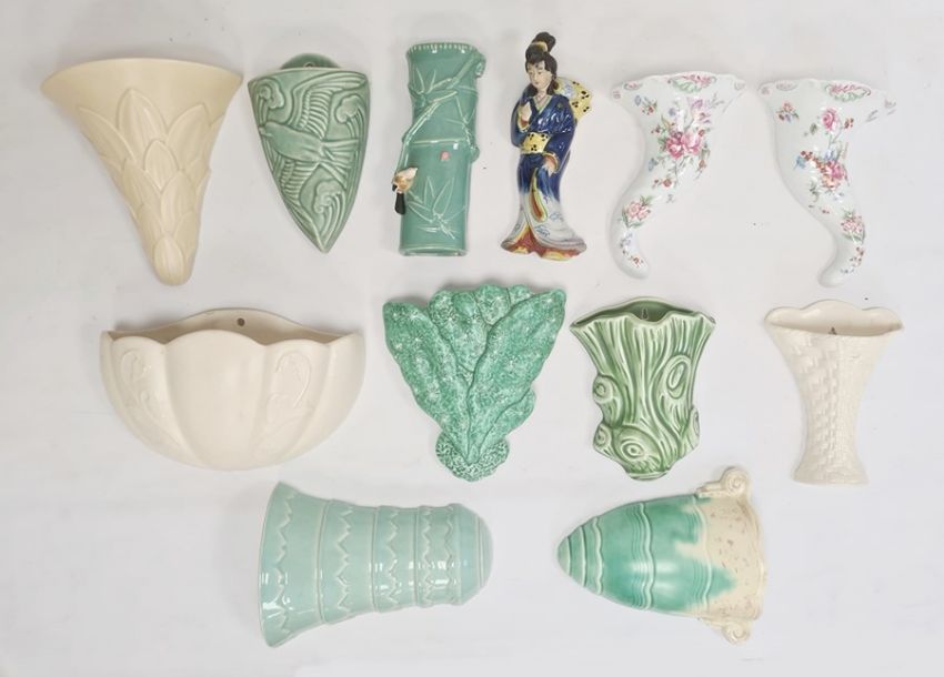 Quantity 20th century pottery wall pockets, Crown Devon, Arthur Wood, Grays, Sylvac and others, two Royal Worcester Compton & Woodhouse wall pockets and an oriental geisha figure wall pocket (12)