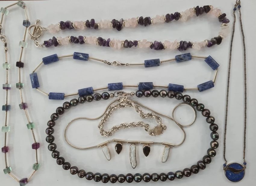 Silver and semi-precious stone necklaces, cultured pearl necklace, etc (1 box)