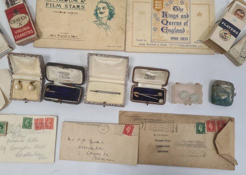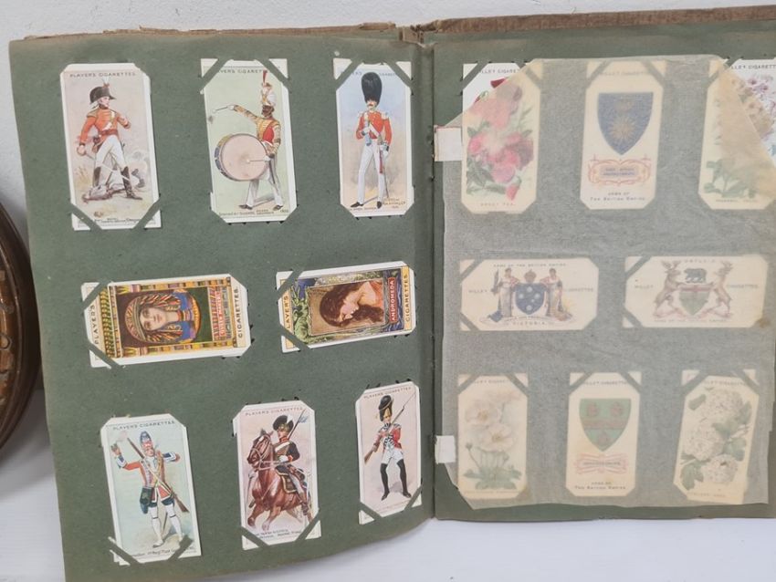 Aneroid barometer in circular oak case, pair 9ct mounted simulated pearl earrings, sundry stick pins, a quantity of cigarette cards in albums and loose and other items