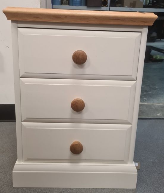 Pair of modern three-drawer bedside tables, the bodies painted white, on plinth bases (2)