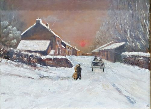 MS (early 20th century)Oil on boardVillage snow scene with horse and cart, initialled MS lower right, 30 x 42cm