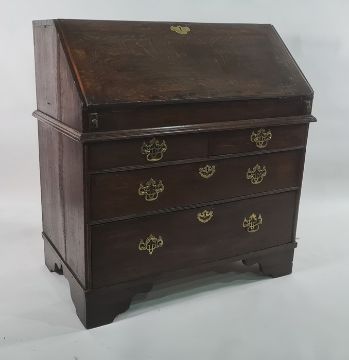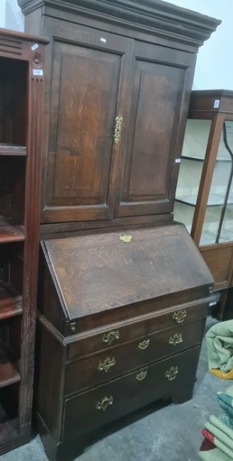 18th century oak bureau bookcase with cavetto moulded cornice above two panelled doors enclosing shelves, fitted interior with well, above three graduated drawers, bracket feet, 98cm x 201cm
