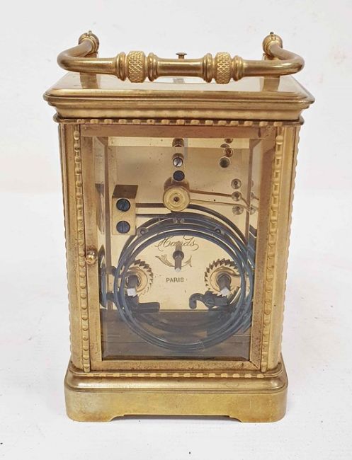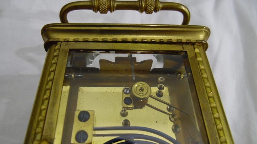 Brass and glass carriage clock with Roman numerals to the dial, in carry case Condition ReportPlease see added photo's. There is no obvious damage except slight marks to areas on base. The clock appears to run and strike correctly. The case has some wear and tear. One corner has peeled slightly.