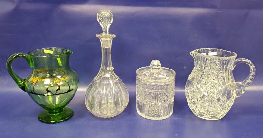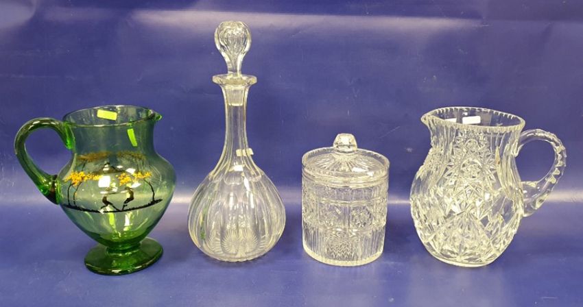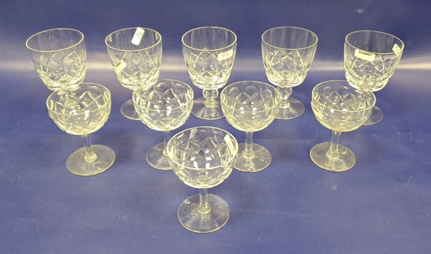 Large cut glass pedestal bowl with raised lozenge decoration, quantity various cut stemmed wines, cut water jug, decanters, stoppers and other items