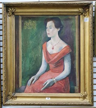 English school Oil on panel Three quarter length portrait of lady in red dress, indistinctly signed lower left, 69cm x 57cm (sitter - Elizabeth Lamplugh)Condition ReportPicture and frame is in fair condition. Some crazing on the frame and cracking at corners.See added photos