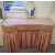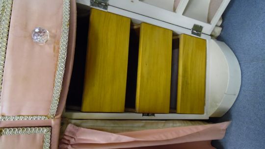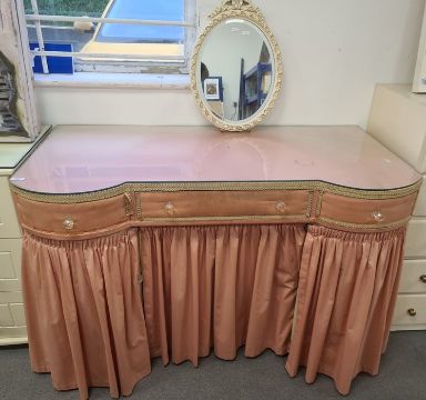 20th century dressing table finished in pink fabric, 122 x 77.5cm together with a dressing table mirror (2) Condition ReportThe dressing table is structurally sound with no obvious woodworm. The fabric covering and lining are showing signs of age and are colour faded in areas, the braid trim is loose or missing in areas. Some  minor bumps and scrapes and one drawer handle is loose.