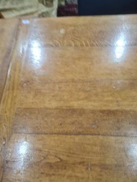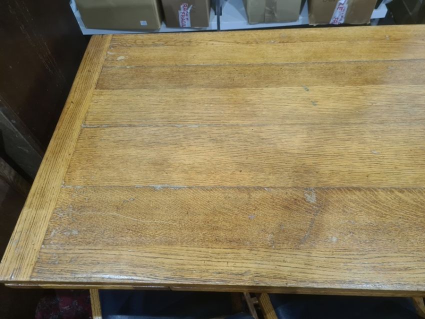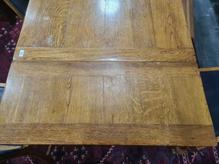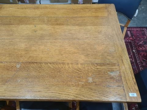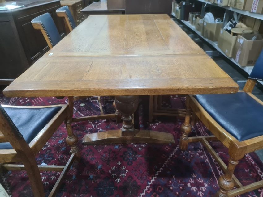 Early 20th century rectangular oak extending dining table with cleated end supports to the top, turned cup and cover end supports, on stretchered base and four oak dining chairs with blue leather upholstered seat and back, on turned and block front supports, stretchered bases (5) Condition ReportThe length un-extended is 137cm and the extended length is 209cm. The width is 84 cm and the height is 75 cm . See attached images.
