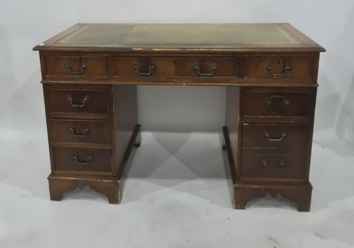 20th century pedestal desk with green leatherette inset top, nine drawers, on bracket feet, top approx 122cm wide