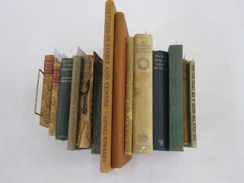 Meade-King, Eric"The Silent Horn, Summer Sketches of Horse and Hound", Collins 1938, colour frontis with tissue guard, other colour plates, black and white ills, rust-coloured cloth with pictorial gilt vignette of horse lower right board, gilt titles to backstrip, backstrip rubbed, corners slightly bumpedEdwards, Lionel "Sketches in Stable and Kennel", Putnam & Company 1936, colour frontis, black and white sketches throughout, brown boards, some shelf wear, brown titlesDawson, Lucy "Neighbours", Collins 1946, colour ills, colour frontis, black and white sketches throughout and other colour plates, yellow boards, dj price clipped and chippedHirst, Mrs Victor"Ponies and Riders, a book of instruction for young riders", Collins 1948, black and white photographs, green cloth (stained) "The Princess Elizabeth Gift Book", Hodder & Stoughton (nd), colour plates, black and white ills throughout, pictorial cloth, rather damaged and other volumes (15)