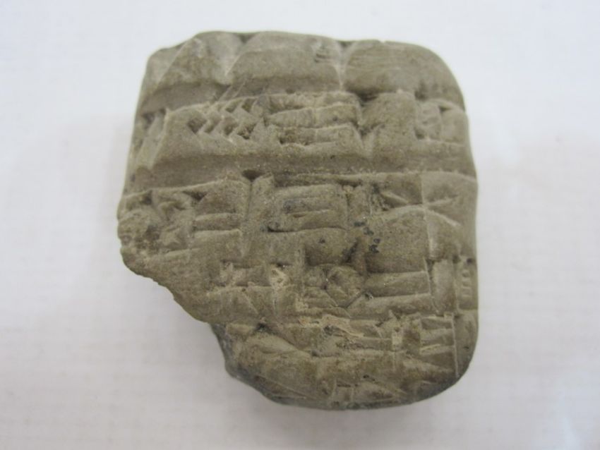Small cuneiform pottery accounts tablet, circa 200BC, with accompanying written inscription 'Small accounts tablet .. receipt for 70 measures of emmer-wheat to make pastry as offerings for the temples. Dated in "the year when (the town of) Shashrum was destroyed", ie the 40th year of Shulgi-King of Ur, about 2000BC'.