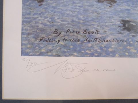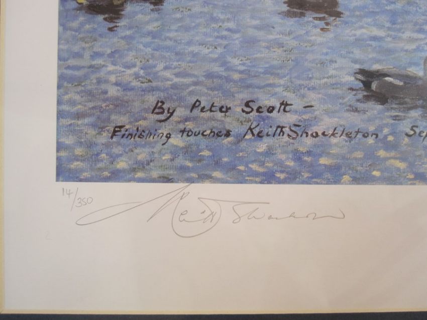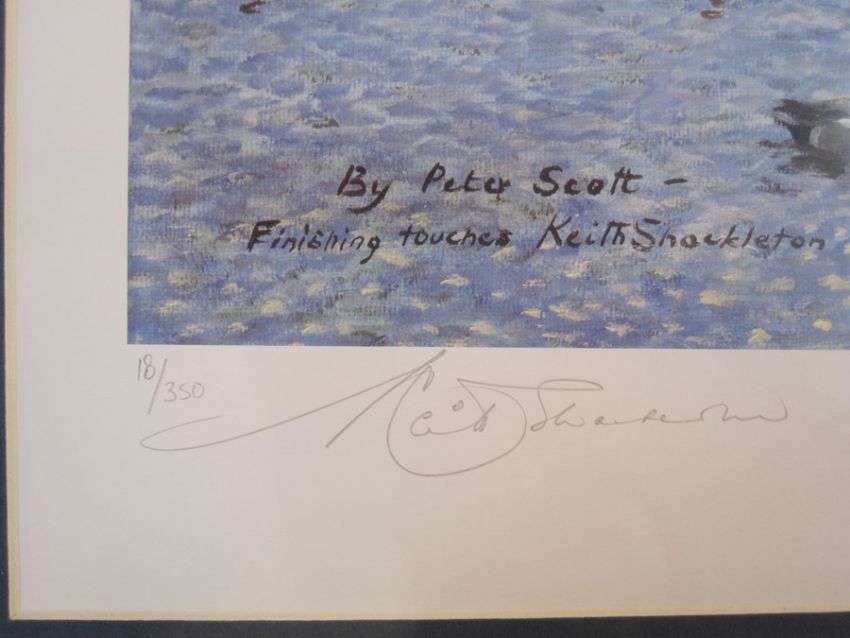 Peter Scott Limited edition print "Barn Elms, finishing touches by Keith Shackleton", limited edition 16/350 with signatures to margin of Philippa Scott and Keith Shackleton, mounted and unframed, 41.5cm x 57cmPeter Scott Limited edition print "Barn Elms, finishing touches by Keith Shackleton", limited edition 57/350 with signatures to margin of Philippa Scott and Keith Shackleton, mounted and unframed, 41.5cm x 57cmPeter Scott Limited edition print "Barn Elms, finishing touches by Keith Shackleton", limited edition 14/350 with signatures to margin of Philippa Scott and Keith Shackleton, mounted and unframed, 41.5cm x 57cmPeter Scott Limited edition print "Barn Elms, finishing touches by Keith Shackleton", limited edition 18/350 with signatures to margin of Philippa Scott and Keith Shackleton, mounted and unframed, 41.5cm x 57cmPeter Scott Limited edition print "Barn Elms, finishing touches by Keith Shackleton", limited edition 56/350 with signatures to margin of Philippa Scott and Keith Shackleton, mounted and unframed, 41.5cm x 57cm (5) "Believed to be the last picture that Peter Scott produced, unfinished, with finishing touches by Keith Shackleton"Part of the Wildfowl and Wetlands Trust Collection