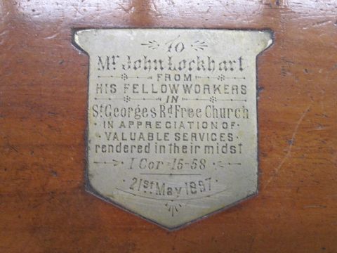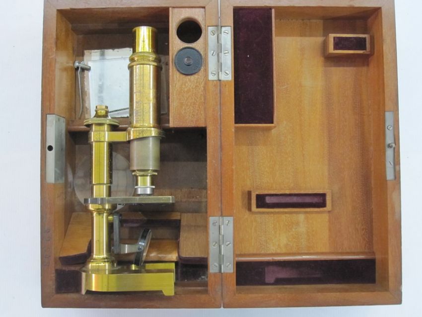 Late 19th century microscope by Leitz Wetzlar, marked to the foot no. 32348, in fitted wooden case, with inlaid inscription to lid of box ' To Mr. John Lockhart from his fellow workers in St. Georges Rd free church in appreciation of his valuable services in their midst 1 Cor 15-58, 21st May 1897'