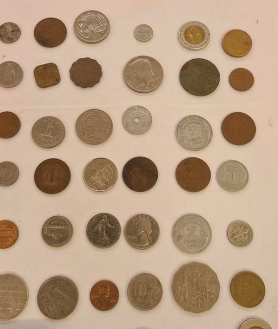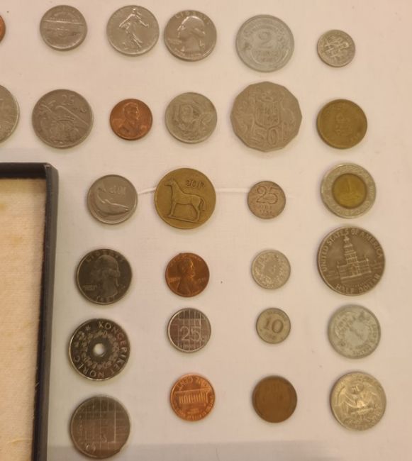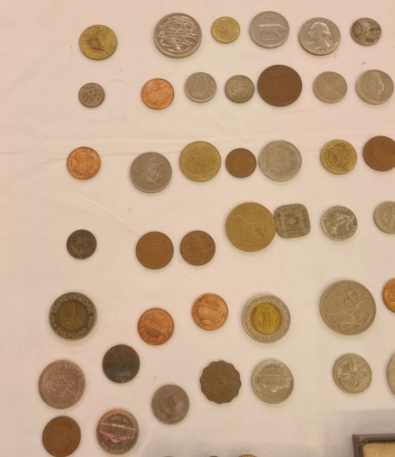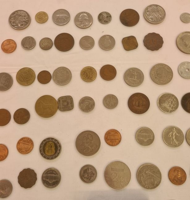 UK proof set of coins, loose coins, buttons, compass and a silver masonic medal