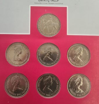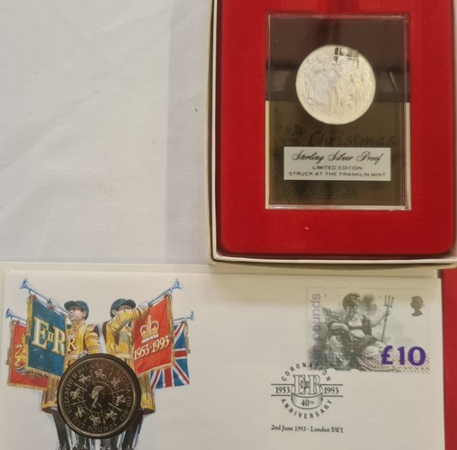 Collection of nickel crowns (7), silver 1976 Innsbruck l00 shillings, 1976 Montreal Olympics 5 dollars and silver 1975 proof 'Christmas' edition commemorative, silver commemoratives (2) Apollo and day of Concorde Coronation Anniversary Crown, with £10 stamp and a possible contemporary forgery of a George III counter stamped 8 reals and various half pennies