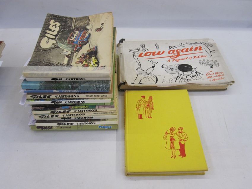 Low, David "Low Again, A Passion for Politics with Colonel Blimp, Hit and Muss and Muzzler", The Cresset Press (1938), pictorial boards, dj chipped with lossLancaster, Osbert"Signs of the Times", John Murray 1961, inscription on ffep, yellow cloth, pictorial with red titles 13 vols of Giles Cartoons 1963, 1965, 1986, 1969, 1994, 1970, 1981, 1983, 1968, 1979, Giles '95, 1966 and Giles 50th (15)