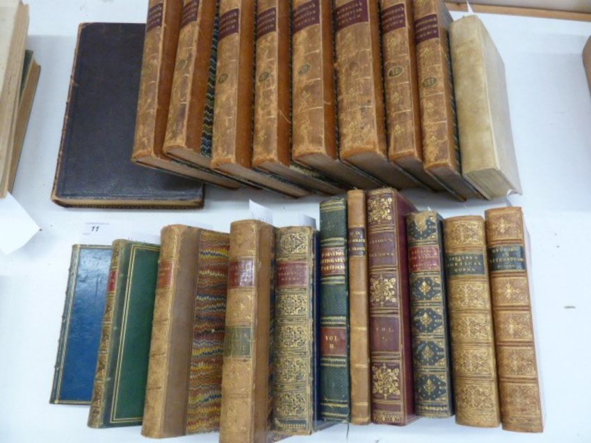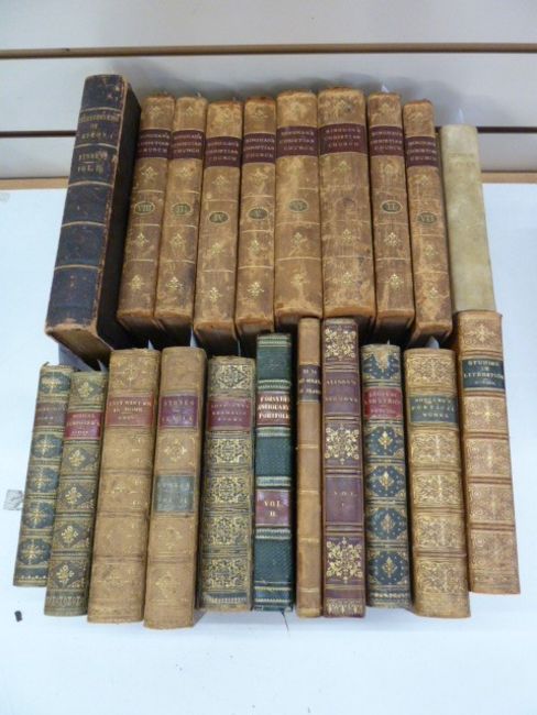Fine bindings, mainly a mixture of full leather, half leather, marbled boards and a bible with vellum boards and to include "Bingham's Christian Church" in eight vols (21)