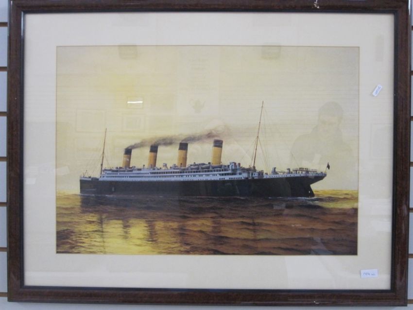 Two pictures relating to the Titanic 'History of Events' with printed pictures and a colour print of the Titanic (2)