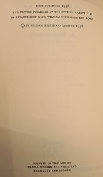 Greene, Graham"The Third Man and the Fallen Idol", William Heinemann 1950, inscription on ffep dated 1950, black cloth with silver titles to the backstrip, dj not price clipped, glassine cover "The Lost Childhood and Other Essays", Eyre & Spottiswoode 1951, beige cloth, bit of offsetting from the dj not price clipped but a bit chipped"Our Man in Havana", The Reprint Society 1958, dj Buchan, John  "The 39 Steps", William Blackwood & Sons 1933, red cloth, dj, backstrip detaching, some loss, glassine cover "The 39 Steps", ills by Edward Ardizzone, J M Dent 1958, The Children's Illustrated Classics, dj, glassine cover "The 39 Steps", with ills by Philip Hood, Chatto & Windus 1985, pictorial boards (6) Condition ReportPlease see additional images