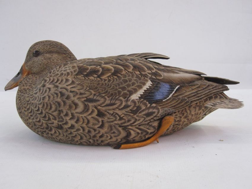 Philip Nelson decoy duck, carved in the form of female mallard, initials to base 16 cms h x 39 cms length approxPhilip NelsonBorn in 1966 in north Wales where he still lives, Philip Nelson showed an interest and aptitude for carving at an early age. When he was seven years old he presented an appreciative headteacher with an owl he had carved from a piece of wood. He trained as a cabinet maker but after being introduced to the art of the decoy by the late Bob Ridges he decided to concentrate on bird carving. In 1987, some of his early work won the admiration of H.R.H. The Prince of Wales.His work is on display in the Nature in Art Museum at Twigworth, Gloucester where his work is the only example of decorative decoy carving accepted for exhibition. This, together with an exhibition of his work at the Ward Museum of Wildfowl Art in Maryland, U.S.A., led to an invitation to exhibit at the prestigious Easton Waterfowl Festival in the same state.He has shown his work at the National Exhibition of Wildlife Sculpture in Norfolk where he won two best in show awards. He has been awarded four best in show awards at the National Exhibition of Wildlife Art, held annually in the north-west of England. His work has been part of The Best of The Best exhibition at the Art in Action event in Oxford. In 2012, Nature in Art showed a 25 year retrospective of his work entitled 'I carved until I set it free'Recently, Philip has concentrated more on the art of the miniature bird and in 2013 was awarded The Gold Memorial Bowl for the best exhibit, a Mallard drake, at The Royal Miniature Society show. In 2015, his miniature Shoveler pair was awarded a commendation at the David Shepherd Wildlife Artist of the Year competition and a miniature Shoveler drake won the award The Best 3D exhibit at The National Exhibition of Wildlife Art.Part of the Wildfowl and Wetlands Trust Collection Born in 1966 in north Wales where he still lives, Philip Nelson showed an interest and aptitude for carving at an early age. When he was seven years old he presented an appreciative headteacher with an owl he had carved from a piece of wood. He trained as a cabinet maker but after being introduced to the art of the decoy by the late Bob Ridges he decided to concentrate on bird carving. In 1987, some of his early work won the admiration of H.R.H. The Prince of Wales.His work is on display in the Nature in Art Museum at Twigworth, Gloucester where his work is the only example of decorative decoy carving accepted for exhibition. This, together with an exhibition of his work at the Ward Museum of Wildfowl Art in Maryland, U.S.A., led to an invitation to exhibit at the prestigious Easton Waterfowl Festival in the same state.He has shown his work at the National Exhibition of Wildlife Sculpture in Norfolk where he won two best in show awards. He has been awarded four best in show awards at the National Exhibition of Wildlife Art, held annually in the north-west of England. His work has been part of The Best of The Best exhibition at the Art in Action event in Oxford. In 2012, Nature in Art showed a 25 year retrospective of his work entitled 'I carved until I set it free'Recently, Philip has concentrated more on the art of the miniature bird and in 2013 was awarded The Gold Memorial Bowl for the best exhibit, a Mallard drake, at The Royal Miniature Society show. In 2015, his miniature Shoveler pair was awarded a commendation at the David Shepherd Wildlife Artist of the Year competition and a miniature Shoveler drake won the award The Best 3D exhibit at The National Exhibition of Wildlife Art.Condition ReportGood overall condition, no visible damage, paint loss or signs of restorationApprox 36cm long x 15cm wide x 15cm high