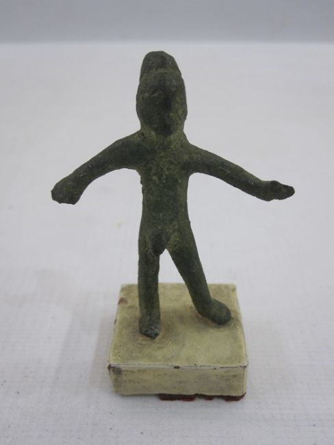 Early Roman/Etruscan-style mounted bronze male figure with arms outstretched, 6.5cm high approx overall, bearing old label to base inscribed 'Phallic figure dug from the ruins of Pompeii'