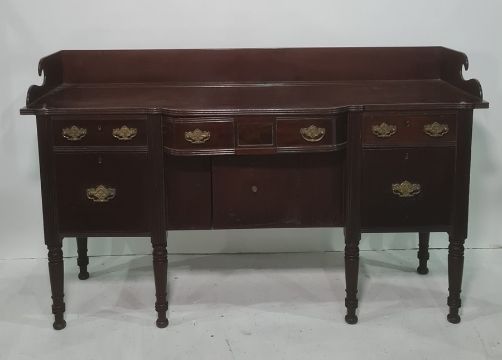 19th century mahogany sideboard with three-quarter galleried back above central cutlery drawer, flanked by two short drawers, cellarette to left hand side, cupboard door to right, kennel door under, on turned supports, 173cm x 104cm