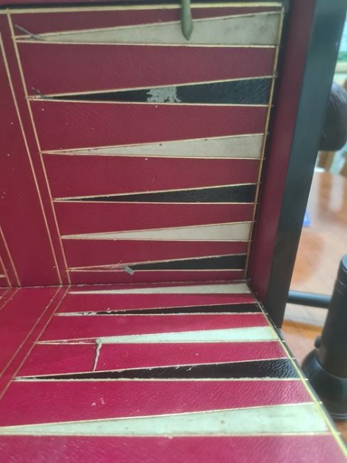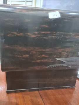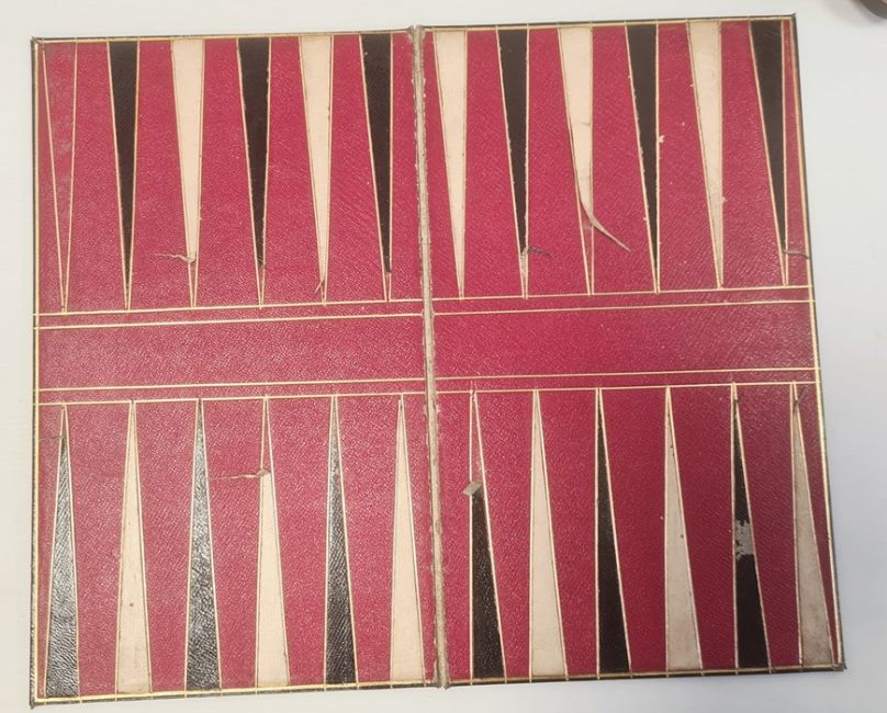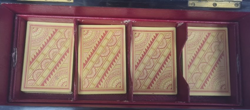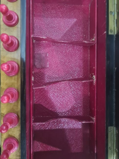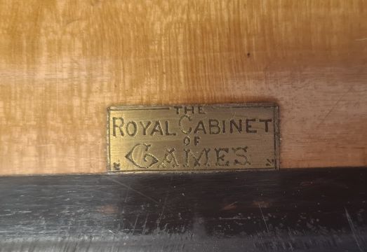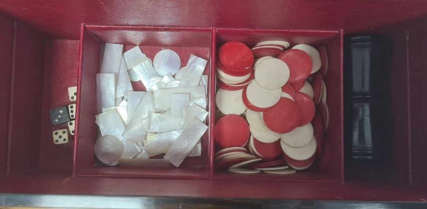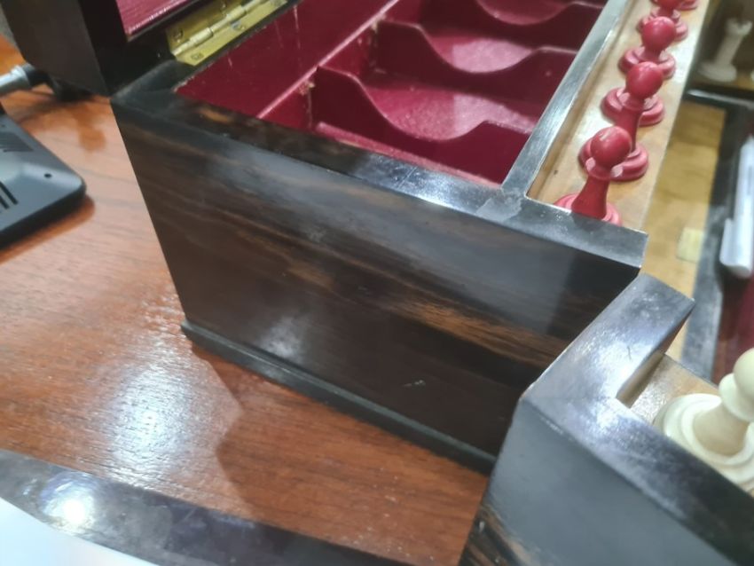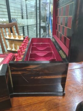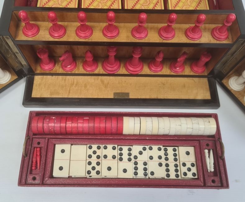 "The Royal Cabinet of Games" coromandel games compendium, rectangular with rounded hinged lid, having folded chequerboard, fitted to interior with red stained and plain ivory chess pieces and having lift-out red morocco card trays with red and white draughts counters and dominoes, mother-of-pearl engraved games counters and tiddlywinks to interior, with black turned wood tumbler, all enclosed by pair folding doors to the front, 32.5cm wide Condition ReportThere is a large area of damage to the top, most of the checkers are cracked or damaged. All the chess pieces, cards, dominoes and checkers seem to be present, i am unable to say if there are any dice or counters missing. Sections of the black gammon board are pealing. The dividers for the middle section are damaged and the handles are missing. See attached images.